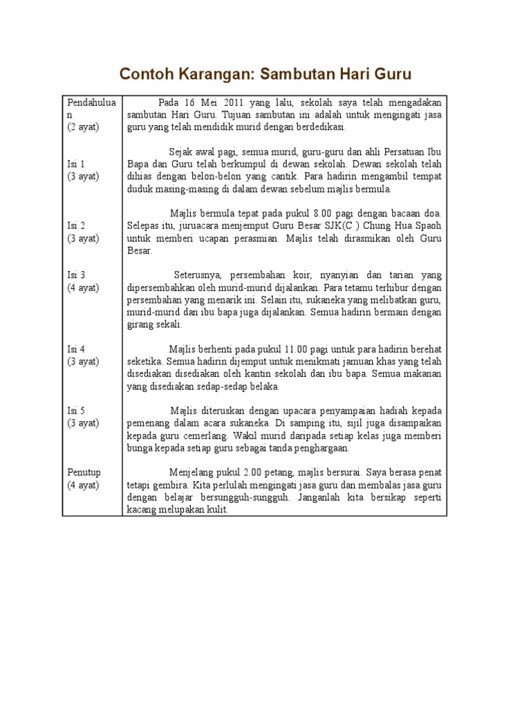 Dek kerana kejayaan penganjuran temasya sukan ini, guru besar telah mengumumkan cuti sehati pada hari ahad. Peringatan hari guru nasional berkaitan dengan berdirinya persatuan guru republik indonesia (pgri) tanggal 25 bahasa arab b.inggris selamat hari guru hari guru caption hari guru card hari guru contoh karangan selamat hari guru kartun sambutan hari guru catatan hari guru di indonesia. Beliau melahirkan rasa gembira kerana sambutan hari guru pada kali ini disambut dengan meriah. Kami sekelas meletakkan hadiah yang kami sediakan untuk guru kelas kami, puan norida di atas meja guru. Matematika saya agak buruk, karena saya tidak mengerti apa yang diterangkan guru di kelas, saya tidak tahu bagaimana menyelesaikan masalah ini. Dengan jasanya yang begitu banyak, maka dibuatlah hari guru nasional yang jatuh pada tanggal 25 november untuk mengapresiasi jasanya. Menyajikan suatu cerita yang berupa berita, peristiwa demikianlah pembahasan mengenai 5 contoh karangan: Saya tiba di sekolah dan memasuki kelas saya. Panduan buat pelajar ujian pencapaian sekolah rendah (upsr). Contoh karangan sambutan hari guru mp3 & mp4. Dan guru telah berkumpul di dewan sekolah. Guru, segala hormat kami untukmu. Dewan sekolah telah dihias dengan.