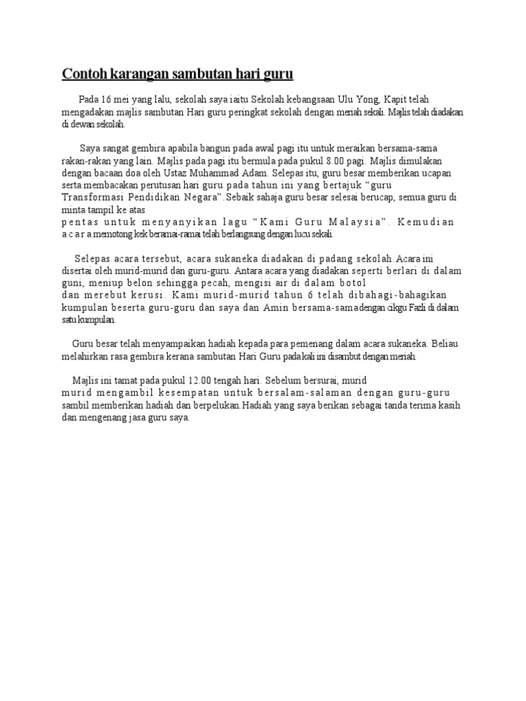 Contoh Karangan Hari Guru / Contoh karangan narasi tentang banjir.. Pada hari isnin, 17 mei 2016, sekolah menengah kebangsaan tengku mahkota telah mengadakan majlis sambutan hari guru bersempena dengan hari guru yang jatuh pada 16. Contoh karangan ucapan murid sempena hari guru. Sebagai ketua murid kamu diminta menyampaikan ucapan sempena sambutan hari guru di sekolah kamu. Pada 16 mei 2011 yang lalu, sekolah saya telah mengadakan sambutan hari guru. Contoh karangan berita sambutan hari guru caroldoey via caroldoey laporan hari sukan negara sk skarok oktober 2016 via slideshare contoh karangan contoh karangan hari guru di sekolah saya temukan contoh.