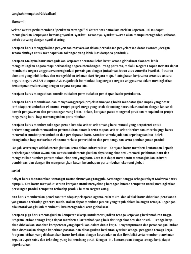 1 Pendahuluan Tajuk Kertas Kerja Ini Adalah Pembentangan Video Tentang Malaysia Dalam Perspektif Ketamadunan Tema Yang Dipilih Adalah Kesan Globalisasi Studocu from d20ohkaloyme4g.cloudfront.net Pada tahun 1995, pengaruh globalisasi semakin pesat dan berlaku perubahan. Apakah impak globalisasi kepada negara kita malaysia : Globalisasi merupakan satu proses untuk meletakkan dunia dibawah satu unit yang sama tanpa dibatasi oleh sempadan dan kedudukan geografi sesebuah negara melalui proses ini, dunia akhirnya tidak lagi mempunyai sempadan dengan ruang udara dan langit sesebuah negara itu terbuka luas untuk dimasuki oleh pelbagai maklumat yang disalurkan menerusi pelbagai perantaraan media komunikasi seperti internet,media elektronik,dan teknologi siber. Dampak positif globalisasi dapat kita lihat dalam berbagai dimensi. Apabila hal ini berlaku maka akan wujud persengketaan seperti peperangan dan sebagainya. Berdasarkan himpunan penulisan dan pandangan bekas perdana menteri kita, tun dr. Satu lagi aliran penting mengenai peranan negara ialah pandangan yang menegaskan peranan negara dalam konteks menangani globalisasi, bukan sebagai penganjurnya. Pendedahan ini berlaku dalam tiga bentuk: