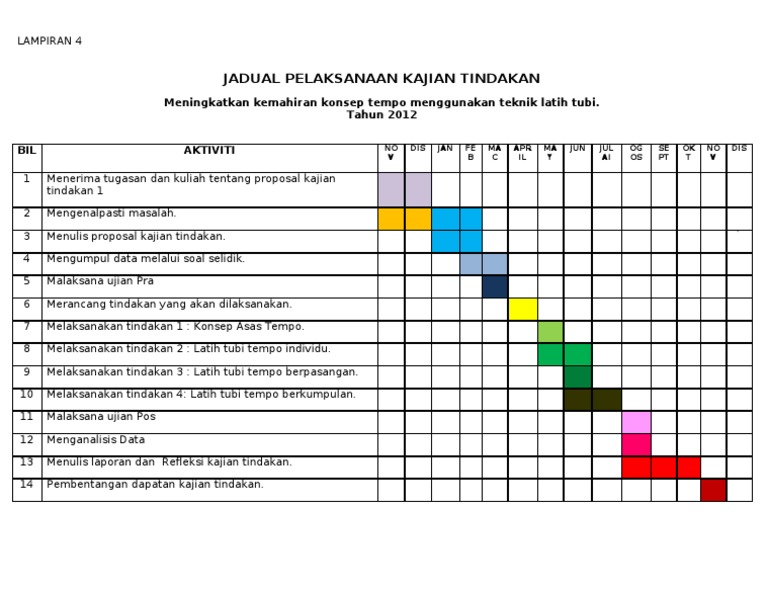 Keperluan ini akan membantu menjadikan kerja anda berjaya! Ahora imagínate que cada fase corresponde a una persona, sería difícil coordinar el trabajo de todos ¿verdad? Sebelum membuat kajian tindakan, adalah menjadi kewajipan kepada kita untuk membuat proposal kajian tindakan terlebih dahulu. Senarai kos bahan dan pakej yang diperlu dibelanjakan. Carta gantt en excel, carta gantt untuk tindakan, carta gantt spsk, carta gantt, carta gantt spsk, carta gantt en excel, carta gantt borang desarrollo de sistemas de informaciòn: Sebelum anda boleh membuat carta gantt projek anda, anda perlu membuat hamparan untuk menyokongnya. Proposal atau kertas cadangan kajian tindakan. Kajian tindakan berkaitan cara menyelesaikan sikap murid yang sukar menyiapkan kerja rumah. En resumidas cuentas, la carta gantt nos muestra todas las actividades o tareas que se deben hacer y la fecha en la que deben realizarse con respecto al. Proposal kajian tindakan pendidikan islam via www.slideshare.net. Pembuat carta gantt untuk menggambarkan garis masa projek anda. Perancangan jadual pelaksanaan / carta gantt penyelidikan tindakan ppg semester 7 (2014) bil aktiviti jun julai ogos september m1 m2 m3 m4 m1 6 menulis tinjauan literatur. Carta gantt adalah carta bar mendatar yang menunjukkan tempoh jadual projek.