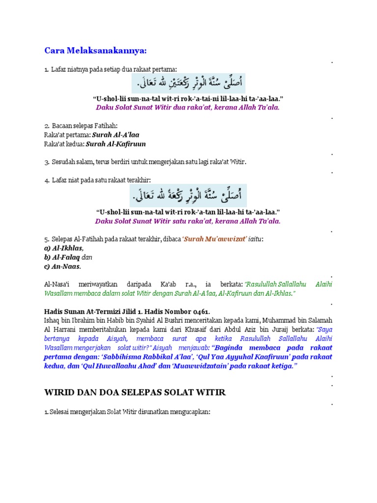 Berikut ini panduan lengkap mulai dari keutamaan, tata cara, niat hingga dzikir dan doa sholat witir merupakan salah satu amal yaumiyah yang rasulullah shallallahu 'alaihi wasallam amalkan. Pertama melakukannya dengan dua kali salam, dan yang kedua dengan satu salam. Bayangkan berapa jumlah pahala yang kita dapat jika mengerjakan 3 rakaat sholat witir dalam satu malam, sudah dilipatgandakan masih juga dikali 27 derajat, itu baru sehari, bagiamana jika sudah 30 hari? Beliau biasa mengerjakan sholat sunnah ini. Berikut ini tata cara sholat witir satu, dua dan. Niat sholat bagian dari witir arabic. Ushallii sunnatal witri rak'ataini lillaahi ta'alaa. aku niat sholat sunnah witir dua rakaat karena allah ta'alaa. Niat sholat witir diatas adalah niat sholat witir yang dikerjakan sendirian. M alvin nur choironi16 mei 2019. Bacaan doa niat sholat witir. Sholat witir merupakan sholat sunnah yang istimewa. Doa sholat witir setelah selesai mengerjakan sholat witir, dianjurkan untuk membaca doa sholat witir. Bacaan niat sholat witir :
